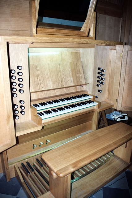 Stół gry wbudowany w centralną część cokołu, pod wieżą piszczałkową, tyłem do ołtarza głównego. 25 głosów podzielonych pomiędzy dwa manuały (10, 9) o zakresie C-g3 i pedał (6) o zakresie C-f1.