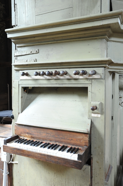 Stół gry wbudowany w lewą ścianę szafy organowej. Pozytyw o 9 głosach i klawiaturze o zakresie E-c3 (krótka oktawa obecnie przestawiona).