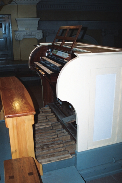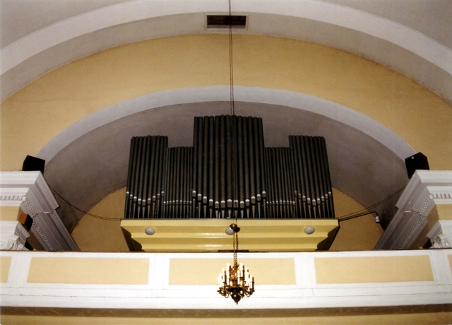 | Manuał I Hohlflöte 8’ Prinzipal 8’ Oktave 4’ Quintatön 16’ Super-oktave 2’ Mixtur 5 f Gedackt 4’* *niegdyś Trompet 8’ | Manuał II Salicional 8’ Vox coelestis 8’ Gedackt 8’ Rohrflöte 4’ Prinzipal 4’ Flet-harmonik 2’** ** niegdyś Cymbel 3 f | Pedał Subbass 16’ Bassflöte 8’ Oktavbass 8’ Oktave 4’ Posaune 16’ |