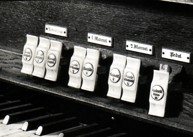 Stół gry wbudowany w cokół szafy organowej, na osi prospektu, tyłem do ołtarza głównego. 5 głosów podzielonych pomiędzy dwa manuały (2, 2) o zakresie C-g3 i pedał (1) o zakresie C-f1.