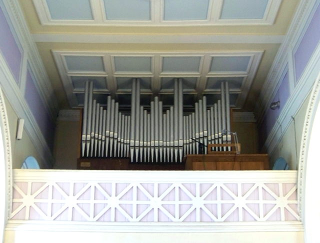 Szafa organowa wolnostojąca, składająca się z cokołu płycinowego i osadzonych na nim wolnostojących piszczałek ułożonych z wyraźnym zaakcentowaniem części środkowej. Prospekt bezstylowy.