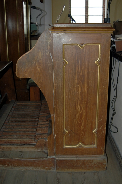 Stół gry wolnostojący, na osi prospektu, przodem do ołtarza głównego. 14 głosów podzielonych pomiędzy dwa manuały (5, 4) o zakresie C-f3 i pedał (2) o zakresie C-d1.