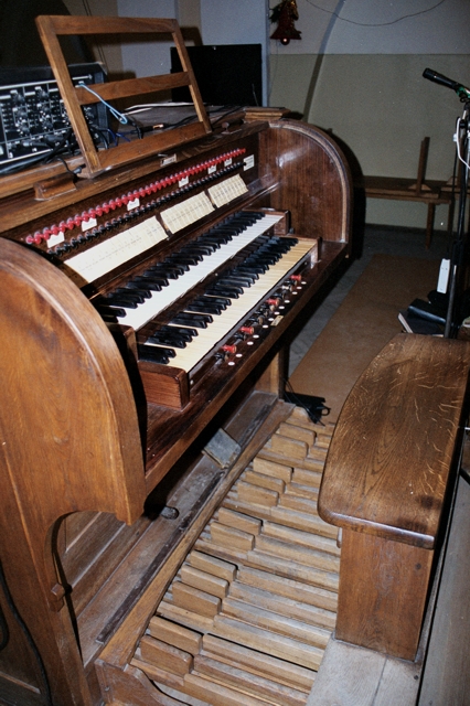 Miech pływakowy z podawaczem klinowym umieszczony wewnątrz szafy organowej; napęd elektryczny.
