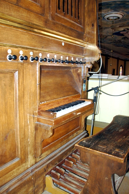 Stół gry wbudowany w lewy bok szafy organowej. 9 głosów podzielonych pomiędzy jeden manuał (7) o zakresie C-c3 i pedał (2) o zakresie C-c.