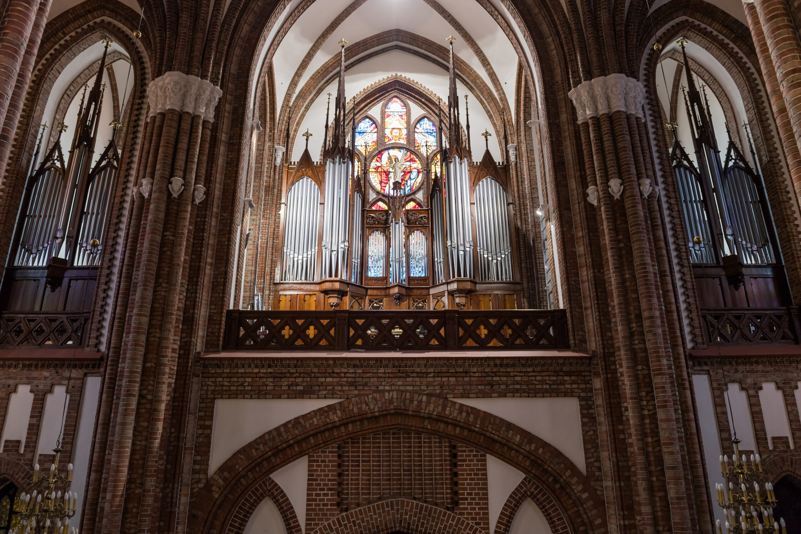 | Manuał I (C – g3) Pryncypał 16’ Bourdon 16’ Pryncypał 8’ Gamba 8’ Waltornia 8’ Amabilis 8’ Dulcya 8‘ Rorflet 4’ Wiola 4’ Oktawa 4’ Kwinta 2 2/3’ Superoktawa 2’ Mikstura 3 chóry Trąbka 8’ | Manuał II (C – g3) Salicet 16’ Pryncypał skrzypcowy 8’ Flet łagodny 8’ Aeolina 8’ Vox celestis 8’ Trawersflet 4’ Dzwonki 4’ * Pikolo 2’ Kornet 2-4 rzędy Obój 8’* Rejestr Dzwonki 4’ został zrekonstruowany w 2018 roku podczas ostatnich kompleksowych prac konserwatorskich przez organmistrza Michała Klepackiego. | Pedał (C – f1) Subkontrabas 32’ Subbas 16’ Gambabas 16’ Fletbas 8’ Oktawbas 8’ Puzon 16’ |