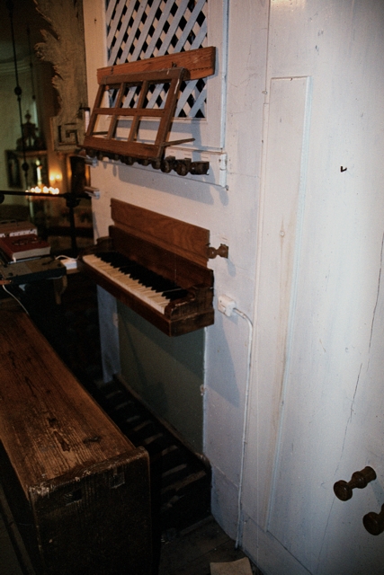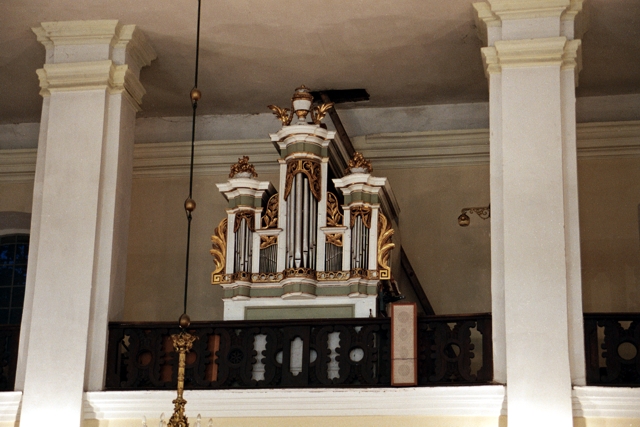 Stół gry wbudowany w prawą ścianę szafy organowej, bokiem do ołtarza głównego. 13 głosów podzielonych pomiędzy jeden manuał (10) o zakresie C-c3 i pedał (3) o zakresie C-c.
