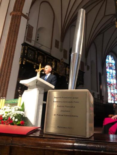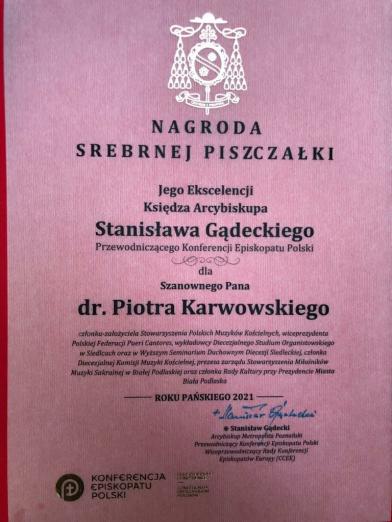 Podczas koncertu Piotra Rachonia w katedrze św. Jana Męczennika w Warszawie, organiście, dyrygentowi-chórmistrzowi i pedagogowi doktorowi Piotrowi Karwowskiemu wręczono Nagrodę Przewodniczącego Konferencji Episkopatu Polski – „Srebrną Piszczałkę”. Statuetka przyznawana jest za wybitne osiągnięcia i wkład w rozwój muzyki sakralnej w Polsce. Nagroda wręczana jest corocznie podczas Międzynarodowego Festiwalu Muzyki Sakralnej w Warszawie.
