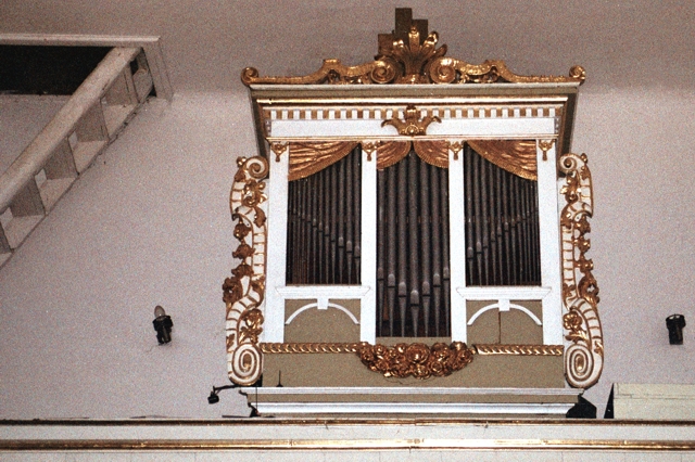 Stół gry wmontowany w lewą boczną ścianę szafy organowej. 9 głosów podzielonych pomiędzy jeden manuał (8) o zakresie C-c3 i pedał (2) o zakresie C-H.