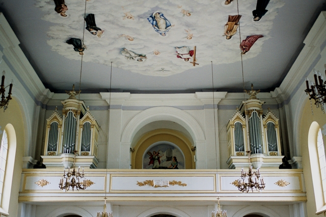 Instrument usytuowany na chórze muzycznym w dwóch bliźniaczych szafach organowych.