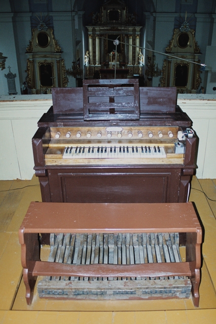 | Manuał Pryncypał 8 stóp Salcion 8’ Flautino 2 stóp (niegdyś Flet 4 stóp) Bordon 8 stóp Oktawa 4 stóp Oktawa 2’ Mixtura III (repetycja na c1) | Pedał Pryncypał 8 stóp Subbas 16 stóp Oktawbas 8 stóp Flet 4 stóp |