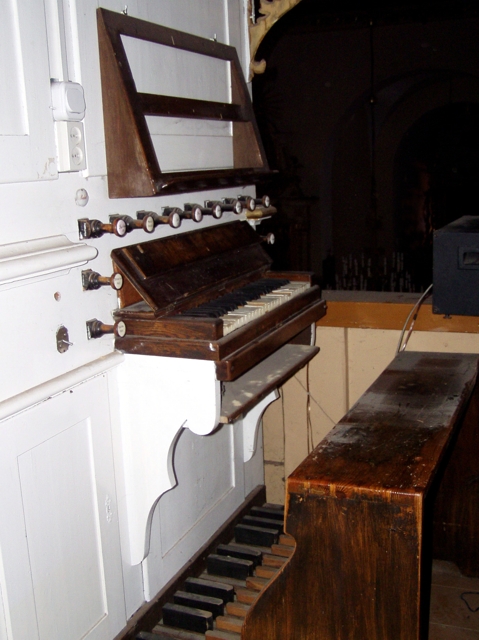 Stół gry wolnostojący, na osi prospektu, przodem do ołtarza głównego. 14 głosów podzielonych pomiędzy dwa manuały (4, 6) o zakresie C-g3 i pedał (4 multiplex) o zakresie C-f1.