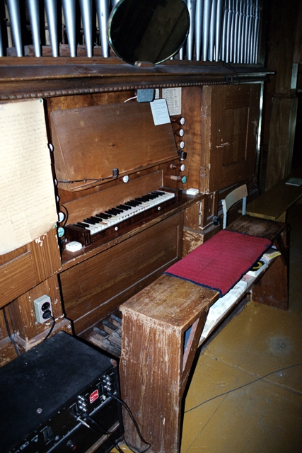 Stół gry wbudowany centralnie w cokół szafy organowej, tyłem do ołtarza głównego. 12 głosów podzielonych pomiędzy jeden manuał (9) o zakresie C-f3 i pedał (3) o zakresie C-d1.