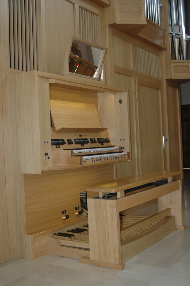 Stół gry wbudowany centralnie w cokół szafy organowej, na osi prospektu, tyłem do ołtarza głównego. 26 głosów podzielonych pomiędzy dwa manuały (10, 10) o zakresie C-a3 i pedał (6) o zakresie C-f1.