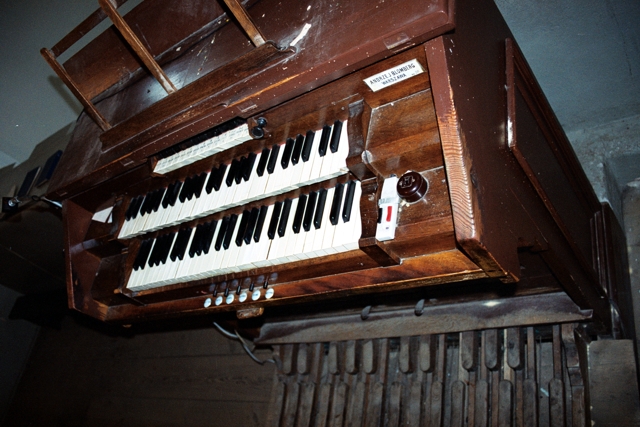 Stół gry wolnostojący, na osi prospektu, przodem do ołtarza głównego. 14 głosów podzielonych pomiędzy dwa manuały (I-7, II-4) o zakresie C-f3 i pedał (3) o zakresie C-c1.