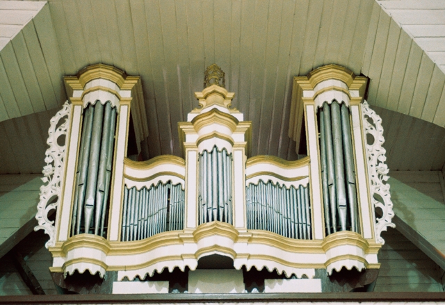 Stół gry wbudowany w lewy bok szafy organowej. 15 głosów podzielonych pomiędzy jeden manuał (12) o zakresie E-c3 (krótka oktawa przestawiona na układ chromatyczny) i pedał (3) o zakresie C-f.